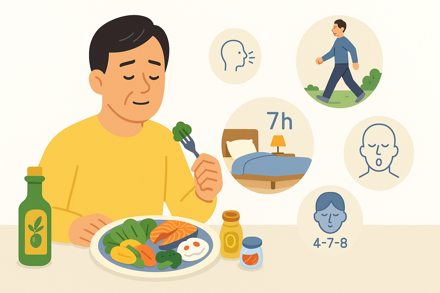 불안·분노가 치밀 때 4–7–8 호흡 3–4회가 염증의 급상승을 막아줍니다. 하루 한두 번 3분 공간 호흡 법(라벨링→호흡→주의 확장) 으로 반응을 선택하는 연습을 하세요.